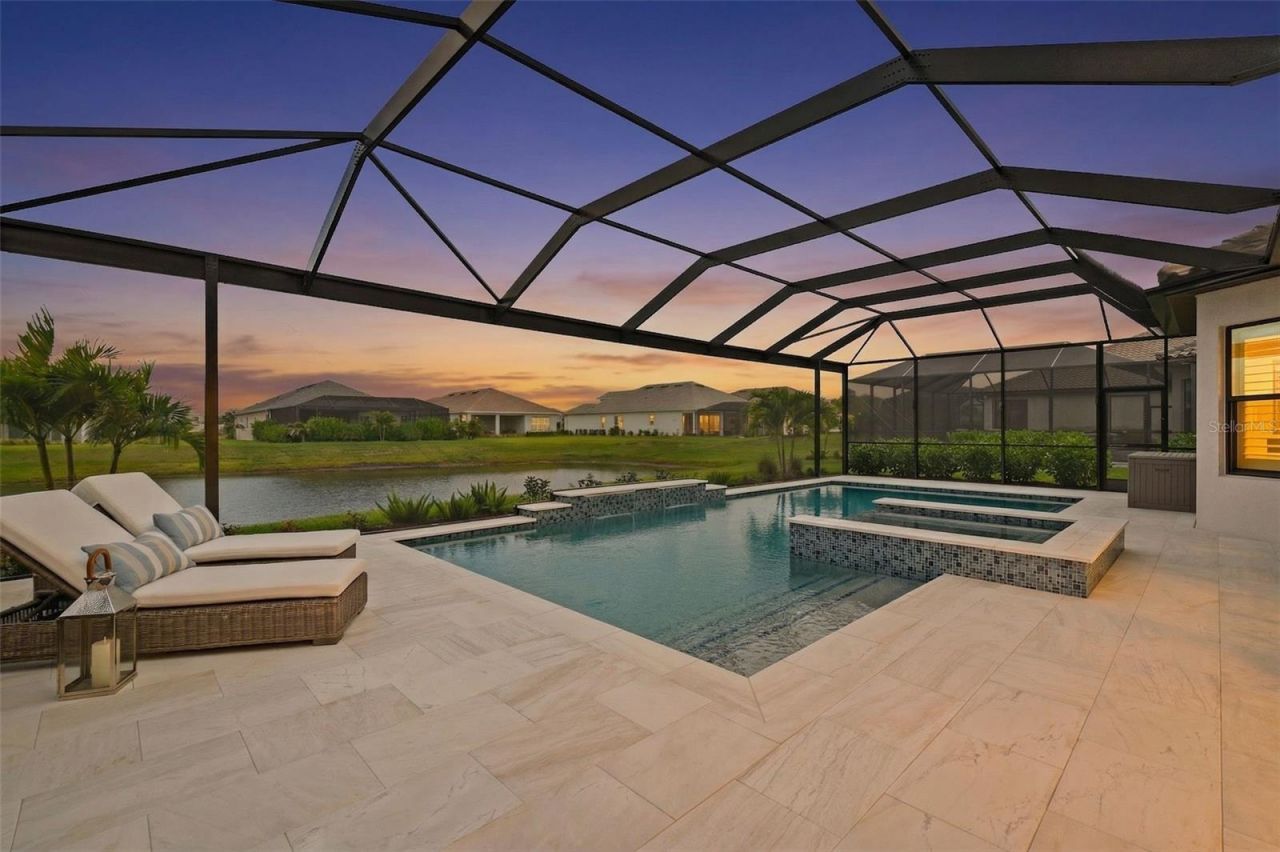 This exceptional Pallazzio floor plan in the resort-style community of Esplanade at Azario offers a rare non-golf, water-view setting with 3 bedrooms, 3 full baths, and a bonus room ideal for a home office or guest space. Tucked toward the end of a quiet cul-de-sac with tranquil water views, this open-concept residence flows effortlessly from room to room. The chef's kitchen impresses with quartz countertops, neutral, glass-tile backsplash, GE Café appliances, natural gas range, and built-in water filtration, while the great room elevates everyday living with a stacked-stone fireplace, built-in mantel, Sonos speaker system, and updated light fixtures throughout. The primary suite is a true retreat, featuring a tray ceiling, spa-quality bath with oversized shower, and a custom-finished walk-in closet. Step outside to a private oasis with an oversized heated saltwater pool and spa, and a fully appointed summer kitchen with stacked-stone wall - ideal for year-round entertaining. Peace-of-mind upgrades include a whole-home natural gas generator, impact-resistant windows, rain gutters, smart-home technology, and a custom security system. No golf membership with this home, so lower monthly dues, yet residents still enjoy full access to Azario's world-class amenities, including resort pool and Bahama Bar, fitness and wellness center, spa, tennis, pickleball, culinary center, and an active country club social calendar. Move-in ready and meticulously maintained - a true blend of elegance, privacy, and effortless Florida living.